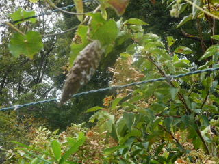 - イノコズチの茎に球状の節、これが「虫こぶ」。半分に割ってみると、ミミズの小さくしたような線状の虫が出てきました。