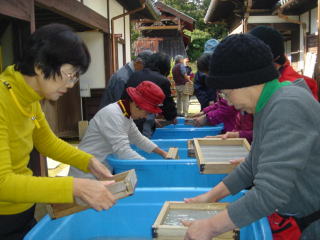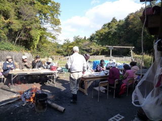 しっかり学べばおなかも空くもの。昼食は手作りの豚汁をおなか一杯戴いた。おまけに比良山にて採取したというカレッジ仲間からのナメコの差し入れもあり、食も大いに進み、午後の作業に向けての腹ごしらえも整った。