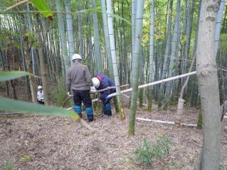 さて、午後は、各人腰には鋸を装着し、ヘルメット、皮手袋、スパッツ(マダニ防止)、靴にはすべり止めの装着と、森林作業者顔負けの万全の出立ちでいざ竹林へ。田淵先生の指導を受けながら、2、3人のグループに分かれて各人孟宗竹の間伐にチャレンジした。約1時間の間伐体験はあっという間に過ぎ、最後に活発な質疑応答があり、解散の運びとなった。