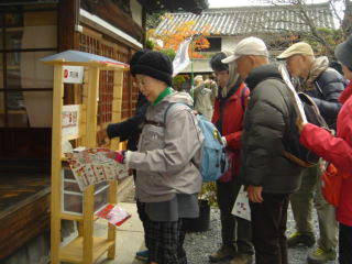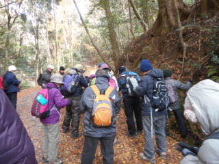 春日山遊歩道を進み、首切地蔵から滝坂の道を引き返すコースで、時折の冷たい風にも負けず元気よく歩く。巨木と巨樹の違い、それぞれの巨樹の特性、樹皮の特徴そしてアラカシに付着したアシノナガキクイムシの現状、大雪による倒木など説明を受けた。