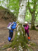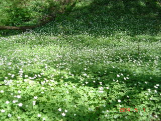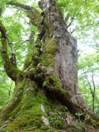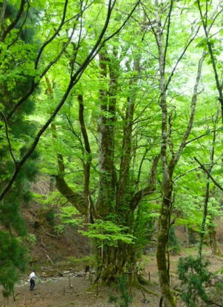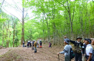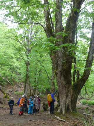 「山笑う」という表現がぴったりの美山の山々が私たちを迎えてくれました。例年より2週間早い5月半ばの芦生の森は所により残雪も見られ、大樹が芽吹く前の新緑の下を、オオルリや「渓谷の歌姫」ミソサザイの声を耳にしながらの期待通りのネイチャー・トレッキングでした。コースは例年同様で、1日目は由良川に沿った「トロッコ道」、2日目は「上谷・杉尾峠」コース。