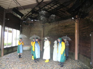 朝方の雨も上がりホット一息。まず琵琶湖の利水、治水、環境についての話を聞く。滋賀県の1/6の面積を占める琵琶湖には118もの川が流れ込み、流れ出す川は瀬田川のみであり、京阪神の人々の暮らしを支える大切な水源で、水の大切さを知る。また雨体験室で1時間600mmの豪雨体感も経験した。