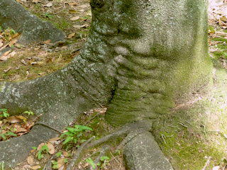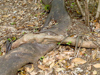 自分の目で、なぜ?の気持ちでじっくり見、自然の営みを知ることが大切、と聞き観察スタート。これまで見過ごし、気付かなかった自然の姿の数々。地に落ちた小枝はなぜ曲がった形をしている?高架道路下の土の所に鳥の足跡と共にある凹みは何?、など身近な所に教材がいっぱい。更には枝の張り方向に対して根はどちらに伸びている?、地表を這っているのも根?アベマキの葉は必ず表を上にして地面に落ちるのはなぜ?ユウカリの葉を食べる犯人はだれ?等々。