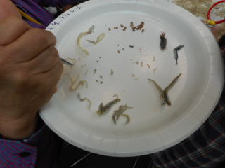 チリモン探しでは、先生の説明を待たずに早速ピンセットを使っての行動開始。なかなかみなさん手早いというかせっかちというか、勉強熱心?でした。タチウオ、イカ、ガシラなどたくさんのチリモンの観察ができました。