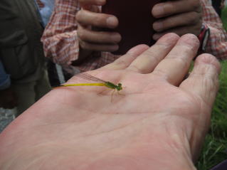 深泥池に到着。でも先生はまだ。先生を待つ間。そこは、さすが好奇心旺盛な講座2年目のカレッジ8期生、三々五々、生き物や植物を自主的に観察。深泥池、広い湿地みたい。池の中の島、浮島?本当に浮いているの??赤・青・緑・黄色・黒・・・いっぱい舞っているカラフルなトンボ、バッタ、水辺の植物等を観察しながら先生を待ったが、会えないので仕方なくスタッフの先導で散策スタート。