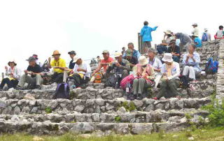 伊吹山ガイド歴13年の藤井氏。「伊吹山の地質は石灰岩でできており、このことが伊吹山の植生を作っています。」そして、「近年、花が少なくなってしまいました。猪・鹿が繁殖しました」と寂しげに話される。