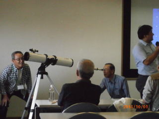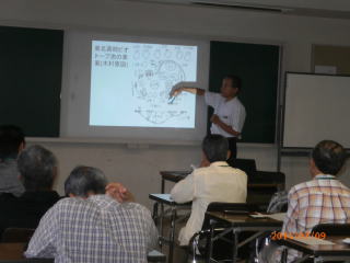 座学の後、徒歩で泉北高校まで移動。スーパーサイエンスハイスクールに指定されている同校は国際交流も盛んだ。木村先生、サイエンス部が管理しているビオトープ池を見学、生物を採取した。外来種のアメリカザリガニ、メダカ、マルタニシ等がとれた。教室で池のプラクトンやボルボックス、ミドリムシ、アメーバー、アカゾウリムシ、ミカヅキモ等々、顕微鏡での微生物観察はあちこちで歓声が!童心になれました。