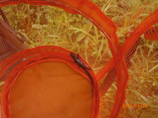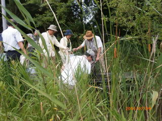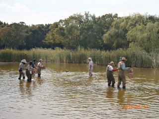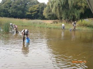 昼食後、加呂登池へ移動。胸まである長靴や太ももまでまである長靴に履きかえ、池の中へ。泥に足を取られながらもモンドリを仕掛け、草の茂っているところや隠れていそうなところを網ですくって生き物を採取した。カダヤシ、モツゴ、タモロコ、ミナミヌマエビ、ヒメタニシ、ヤゴ、ザリガニなど、小さな生き物が一杯。残念なことにメダカは捕れなかった。一人も池にドボンすることなく、終了しました。