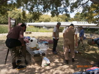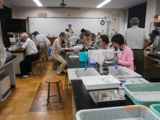 午前の講義は、淡水魚の歴史から始まり、エッと受講生が驚いた、煮干しの解剖に入っていきました。ルーペ片手に爪楊枝、カッター、慣れない細かな作業に悪戦苦闘。脳、心臓、耳石、肝臓等々、取り出し。二枚おろしの後は、ランチ前のおやつにする人も。
