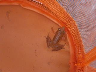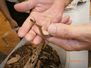 午後は、ふれあいの森でどっきりの出会いを探索。連日の猛暑で、小川の流れも少なく、カエルやトカゲを見つけるのに一苦労。期待していたヘビとはついに出会えませんでした。ふれあいの森で飼育していた小さいヒバカリで、ようやくヘビ体験。ヒバカリは大人しく噛まない。思わず触ってしまいました。