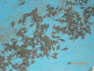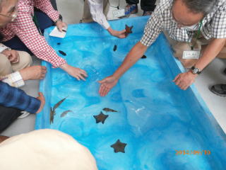 今、約10種類の稚魚を育てています。センター内の大きな水槽で稚魚(カレイ、オニオコゼ)を見学、その可愛らしい動きに思わず歓声が(美味しそうって声も聞こえたり?)