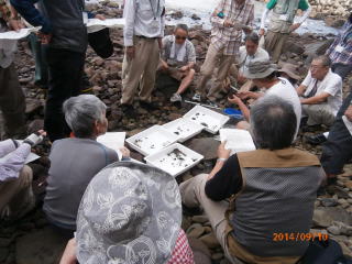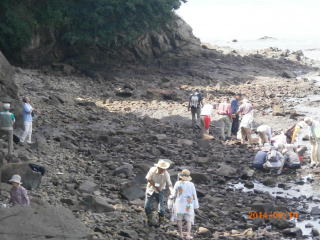 昼食後、豊国崎へ。丁度、干潮で磯も広く、生物を探して、石をひっくり返したりして、貝やかにを採取。いつものように集めて、みんなで山田先生の解説を楽しく伺いました。