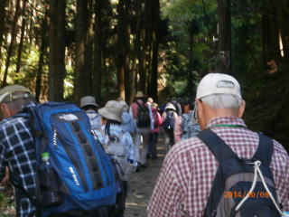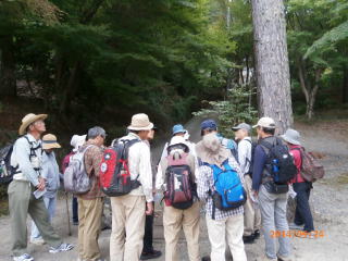 まず、神於バス停より植物観察しながら神於寺へ。出迎えてくれたテーダマツを見上げながら、山道を行く。神於山頂の国見の森広場で昼食後、山を下り、バスで意賀美神社へ。ここは「雨降り大明神」とも呼ばれている。日照りには、滝の水をさらえて神前に祈ると、必ず雨が降ったことから「雨降りの滝」と呼ばれ、神社の森には、くすのき・やまももなど、約70種の暖帯樹が茂り、市の天然記念物となっています。また、大阪府の「みどりの百選」の一つに選ばれています。