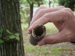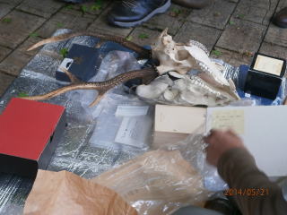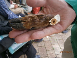 朝は小雨が降っていたが、午後から晴れてきて長野公園で昼食後、早川先生とフィールドサインを探しに行く。雨が降った後だったので、足跡などはやはり見つけられなかったが、イタチの糞、けものみちを観察後、休憩所で先生の持参していただいた標本を前に講義。鹿の角や足、コウモリの骨格標本、ビロードの手触りのモグラの皮革、テンの姿の皮革等々、珍しい標本と先生の愉快な説明に興味一杯の講義でした。