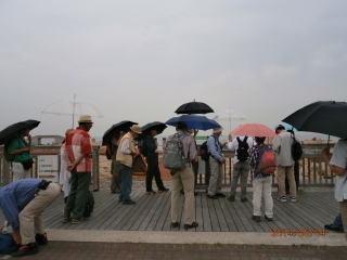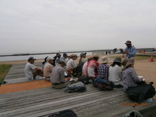 場所を移動。河口の干潟再生地を右に見ながら、海を前に涼しいところで昼食。