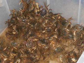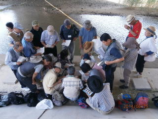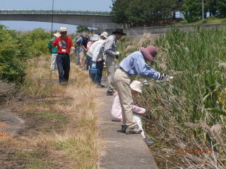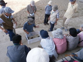 事前に手製のカニ入れをペットボトルで作って来た受講生も(なんと21個も!9期生全員分です)。釣り竿に餌のちくわ、重しをつけて釣り始めました。釣れたカニを一か所に集め、先生からカニの説明。今回は8割位はアシハラカニ。後はクロベンケイカニ、ハマカニなど絶滅危惧種Ⅱ類のハクセンシオマネキも見れた。