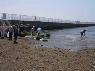 午後は浜辺の生物を探した。小さい岩を除けるとケフサイソカニ数ミリのヨコエビ、アサリ、ムール貝、イボニシ、モクズカニ、ミミズハゼ等がいた。帰りは、貝塚市立自然遊学館を見学しました。(貝塚で発見されたアンモナイトの化石を元にデザインされたユニークな建物)